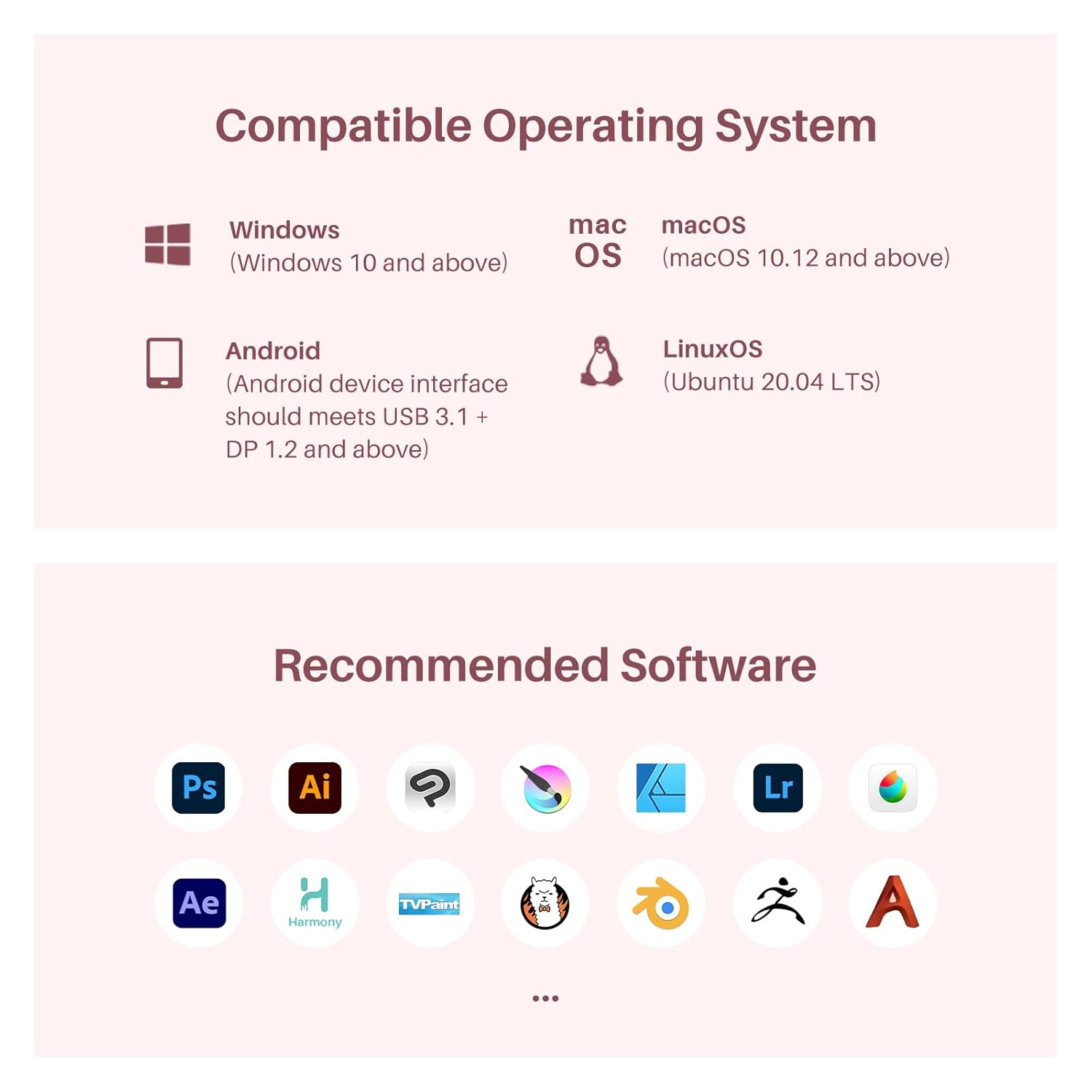 • Strong Compatibility: Kamvas 13 (Gen 3) pen display supports a variety of mainstream software. It is compatible with Windows 10 or later, Mac OS 10.12 or later, Android devices that support USB3.1 GEN1 and DP1.2, and Linux OS(Ubuntu 20.04 LTS).